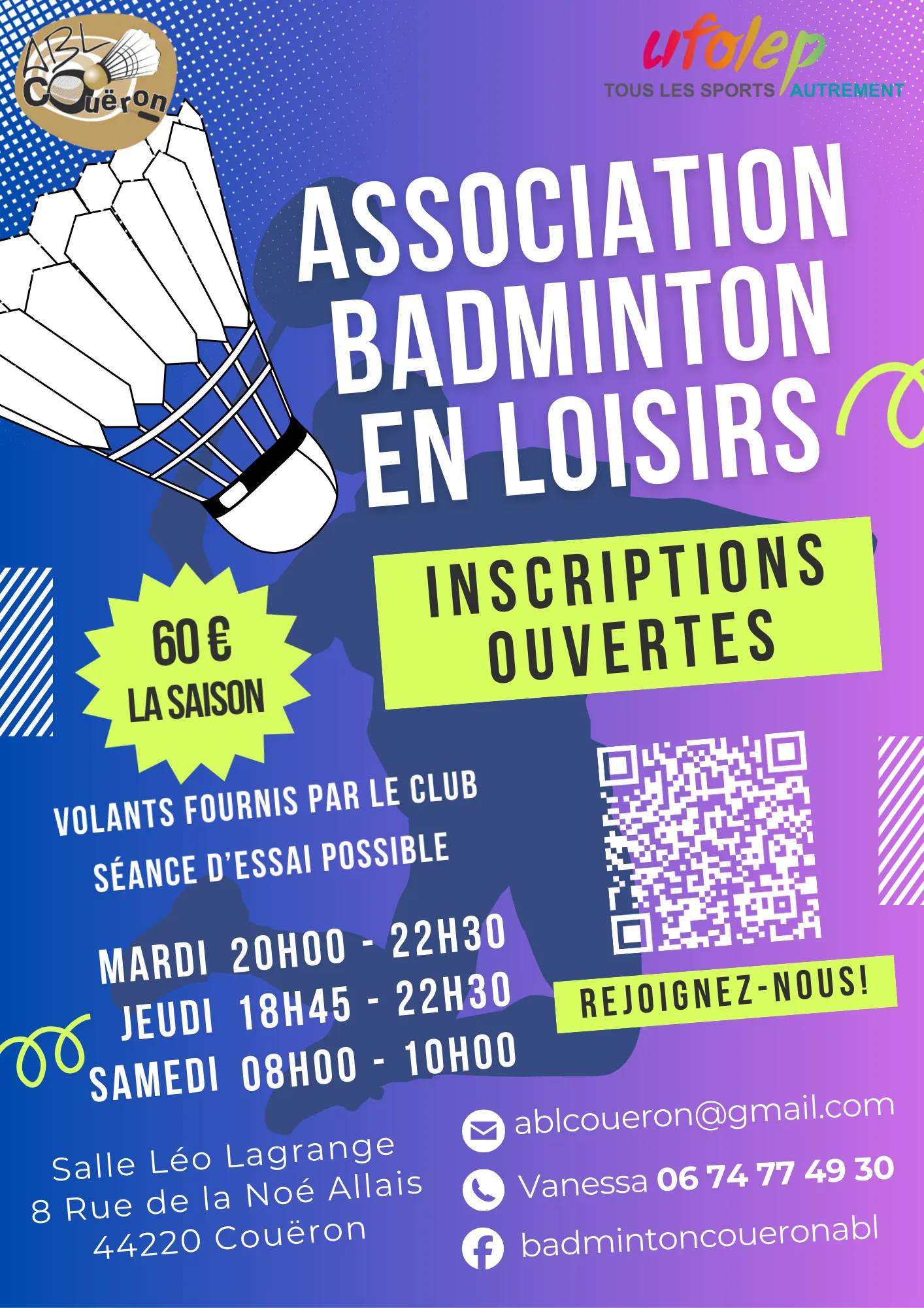 - Facebook : https://www.facebook.com/badmintoncoueronabl