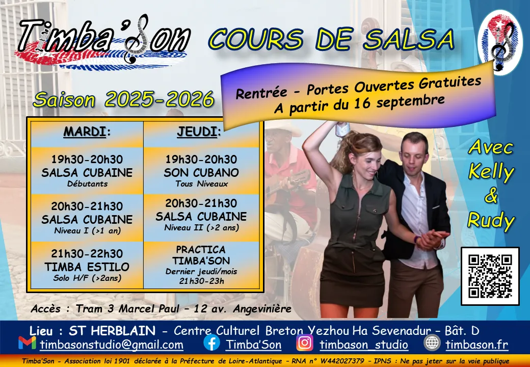 Timba’Son est animée depuis 2022 par Kelly et Rudy, couple de danseurs Couëronnais passionnés par les danses populaires cubaines depuis plus de 15 ans, aguerris grâce à leur formation en France, en Europe et à Cuba, et intervenant dans le grand ouest depuis une douzaine d’années.