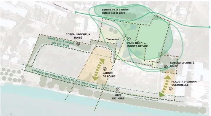 Sur la partie haute de la falaise, un parc sera aménagé avec différents cheminements piétons qui permettront de rejoindre la médiathèque ou les services publics en mobilités douces. La multitude de formations végétales, base de la composition du quartier, offrira un espace de respiration pour les habitants et une vue imprenable sur le fleuve. Un jardin de Loire sera également aménagé au cœur du quartier.