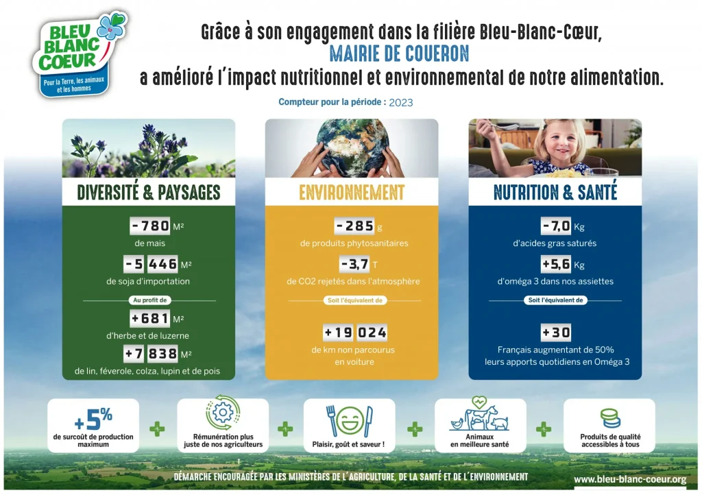 • 11% de produits Bleu-Blanc-Cœur, avec notamment une semaine de menus Bleu blanc Cœur entre chaque période de vacances, et une sensibilisation des enfants à cette filière alimentaire. La Ville a intégré ces approvisionnements et mis en œuvre une démarche justifiant l’externalité environnementale positive de ces denrées.