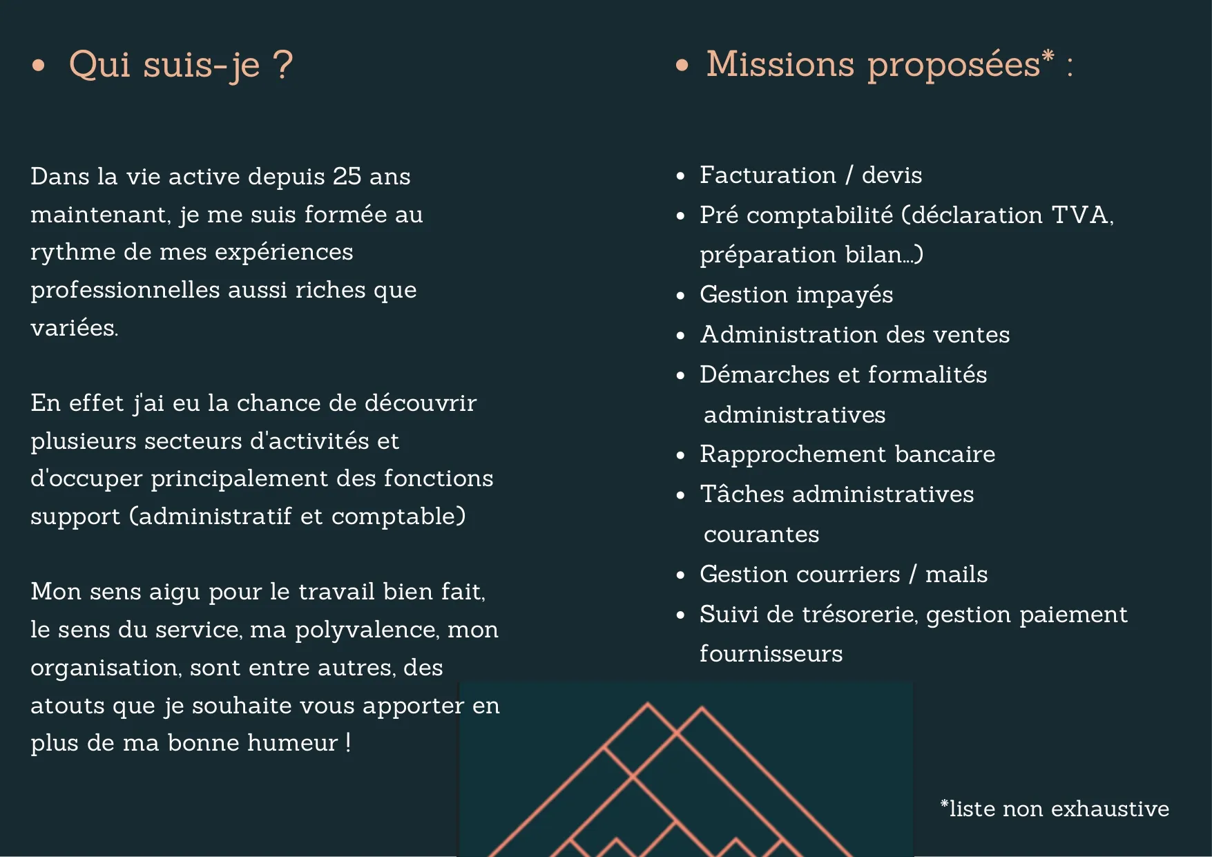 Le but est de vous faire gagner un temps précieux en me confiant toutes vos tâches administratives ou commerciales (facturation, recouvrement, saisie de données, phoning, prospection, gestion administrative, relation clients…) de façon ponctuelle ou régulière.