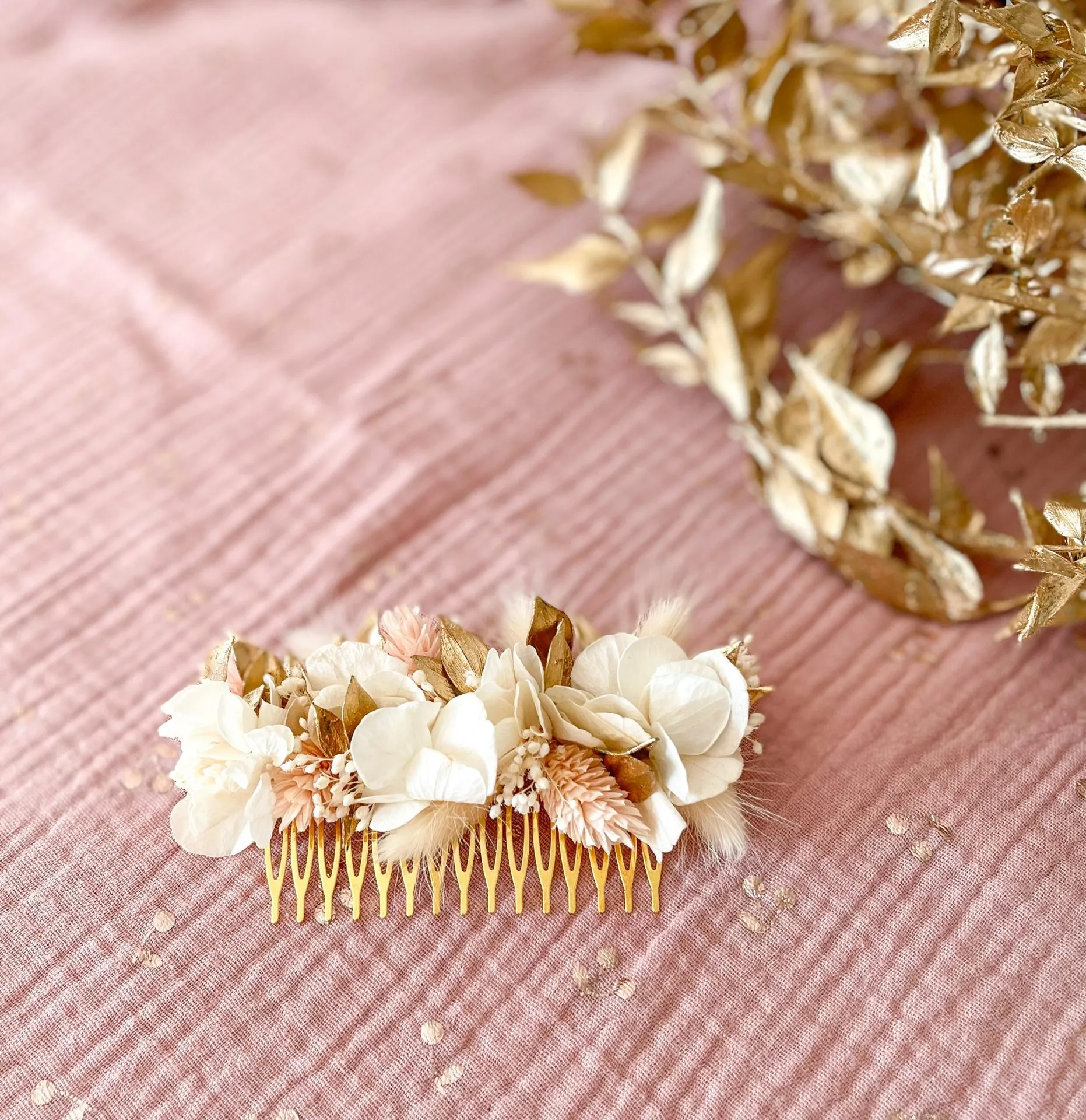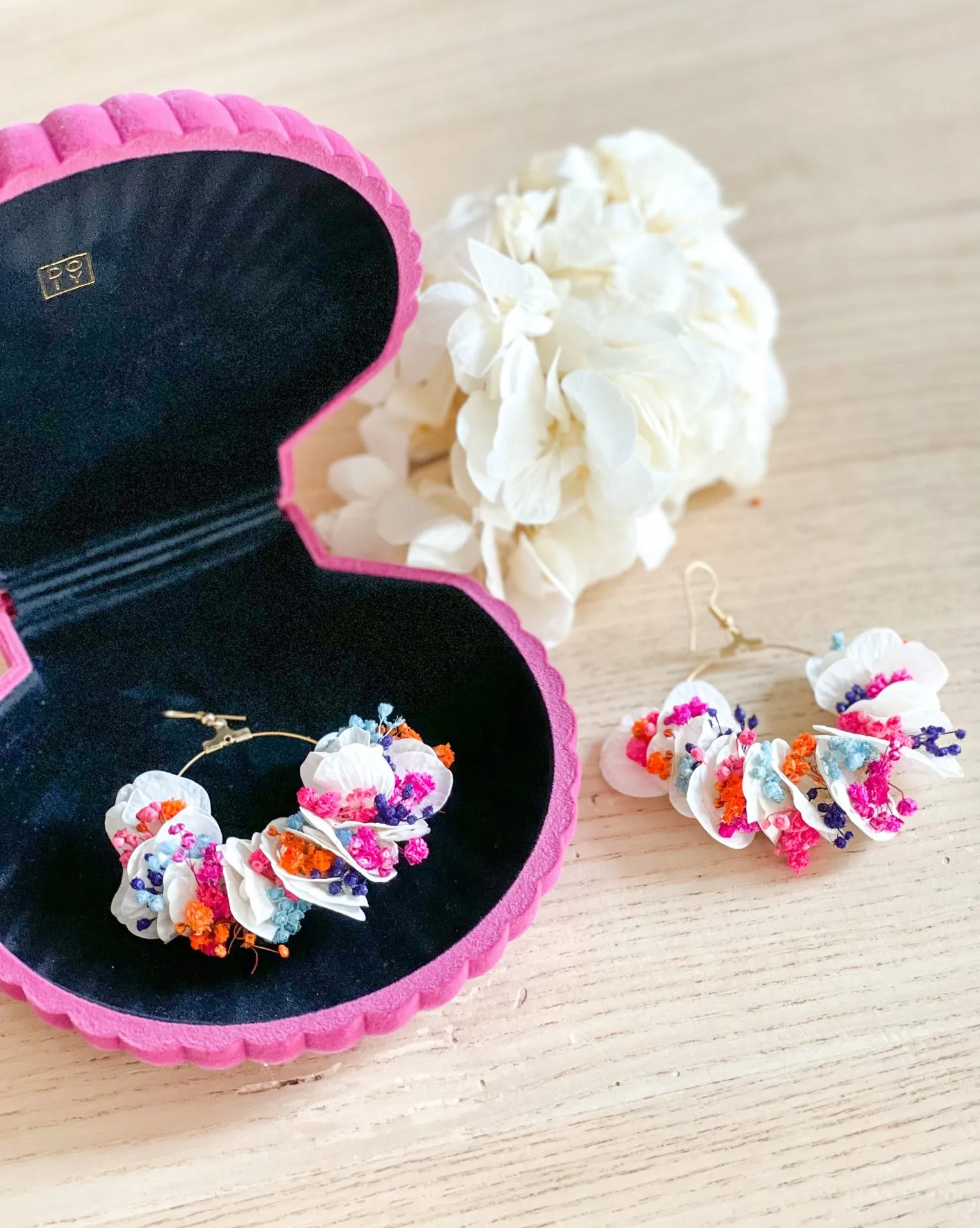 Je réalise de délicates boucles d’oreilles en hortensias et fleurs stabilisés pour égayer le quotidien avec une touche d’éternité.